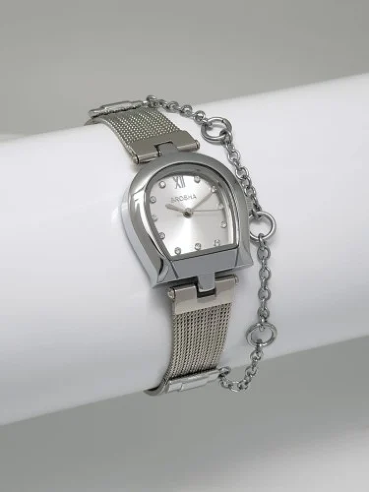 ساعة نسائية بتصميم كلاسيك ، ساعة بسير من الستانلس ستيل باللون الفضي وفصوص داخلي ، تأتي الساعة بتصميمها العصري الملفت للأنظار ، ساعة بميناء بلون فضي تضيف هذه الساعة لمسه فخامه على إطلالتك وتبرز جمال طلتك . ارتدي هذه الساعة لسهره مسائيه خاصه او اجتماع عائلي مهم ، يمكنك تنسيق الساعة مع العديد من الإطلالات الأنيقة .