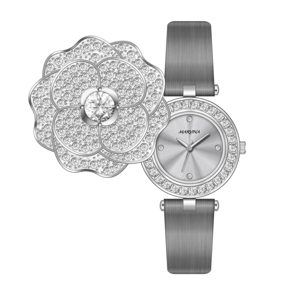 أضيفي لمسة من الفخامة إلى إطلالتك مع ساعه يد نسائيه MARVINA المصممة بأناقة من الجلد الفاخر بتصميم دائري أنيق ولون فضي لامع، تجسد الساعة جمالاً لا يُضاهى.