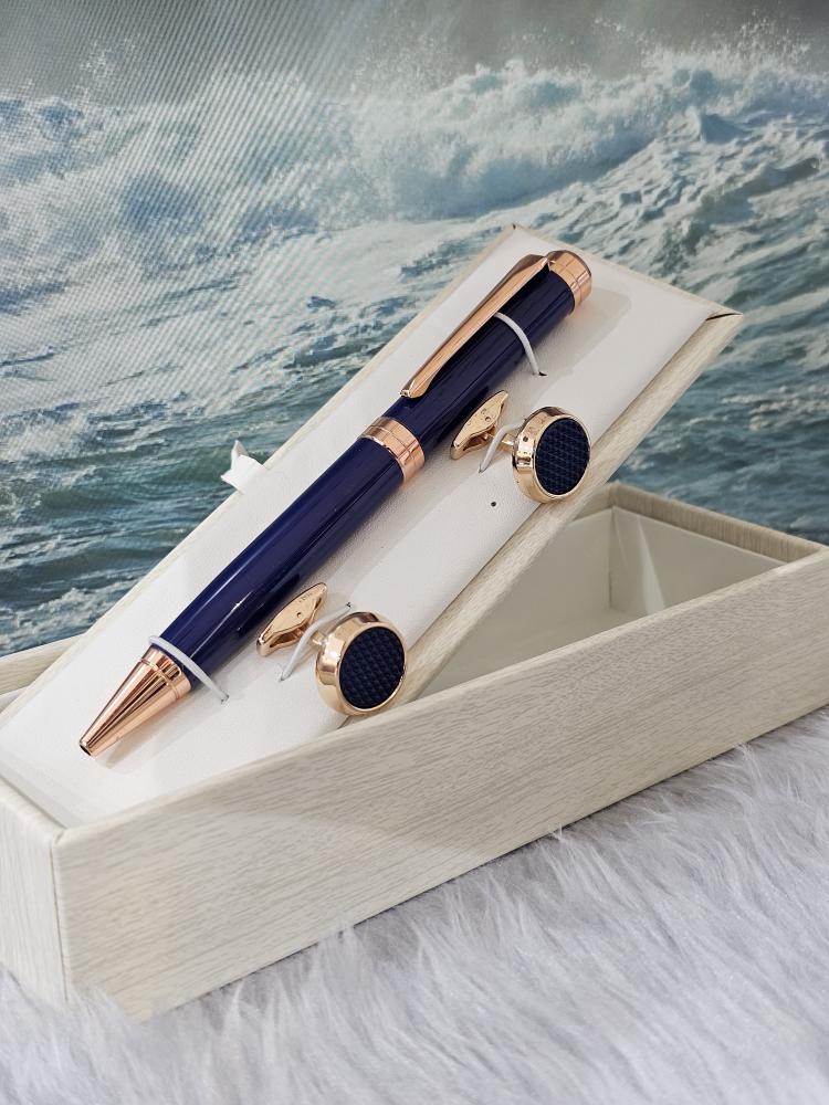 - تميز القلم والكبك والعلبة بتصميم متناسق ومتوافق بلون كحلي في ذهبي يضفي عليهما مظهرًا جميلاً وأنيقًا.