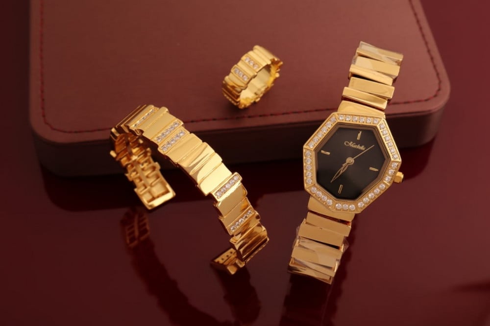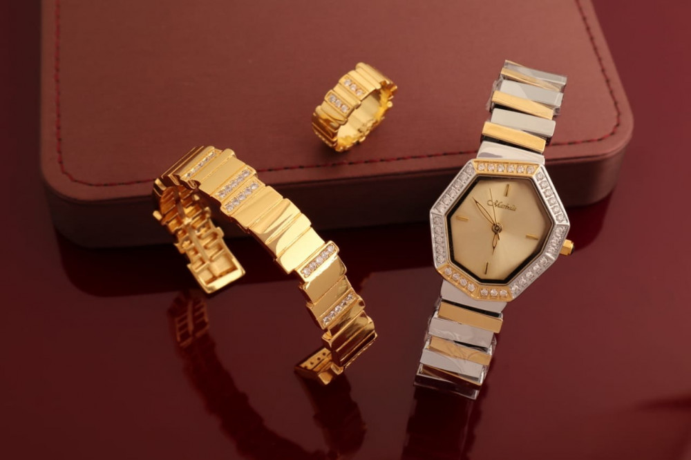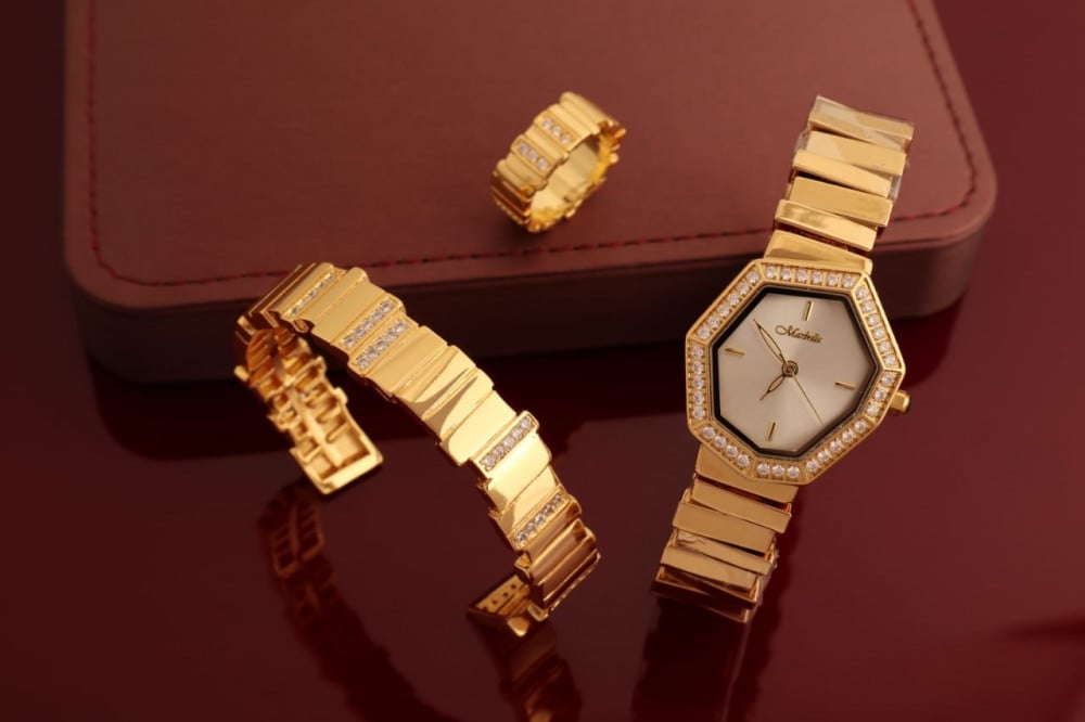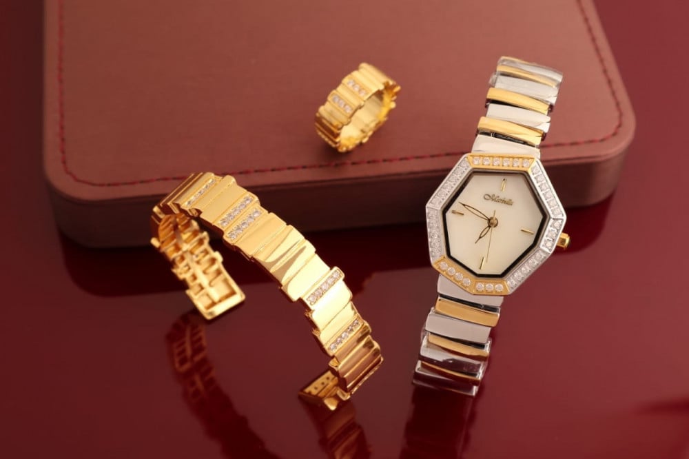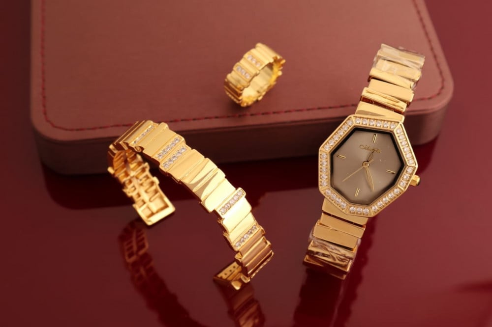 == ساعه نسائية استيل خامة مرتبة قفل فراشة فل زيركون كبس الماس .