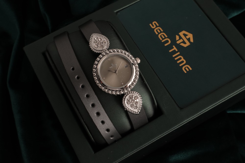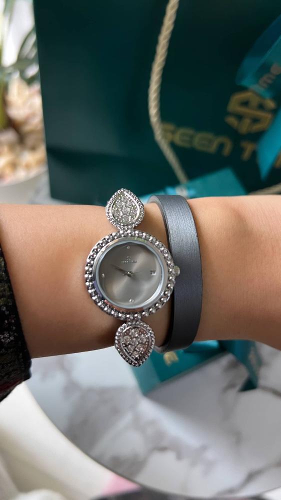 هل تبحثين عن ساعة تمنحك لمسة من الجمال والأناقة في كل لحظة؟ إذاً، ستكون ساعة النساء من ماركة SEEN TIME اختيارًا مثاليًا بالنسبة لكِ، تمتاز هذه الساعة بتصميم مذهل يجمع بين الأناقة والفخامة، حيث يتميز القرص الدائري باللون الفضي والمُرصّع بالزركون بلمسة من اللمعان والسحر الذي يجذب الأنظار.