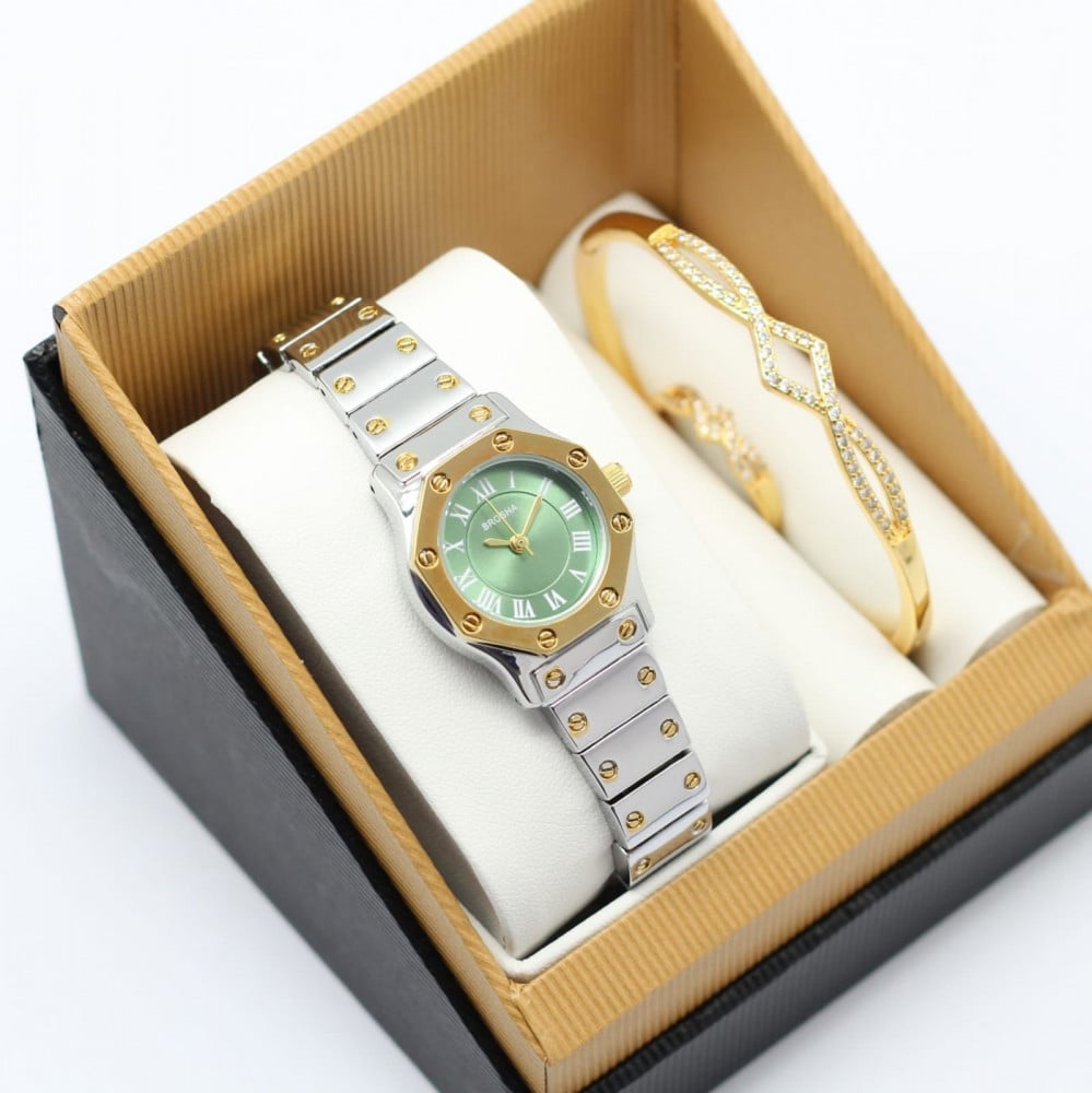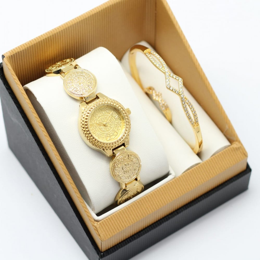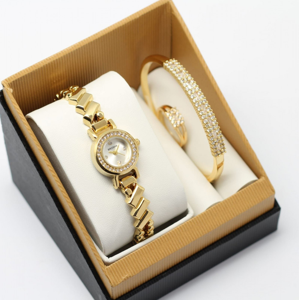- هذه الأطقم تتضمن ساعة أنيقة، اسوارة جذابة، وخاتم فاخر، مصممة خصيصًا للنساء الأنيقات.