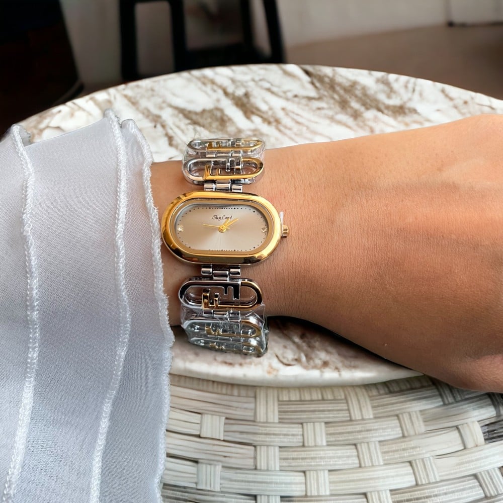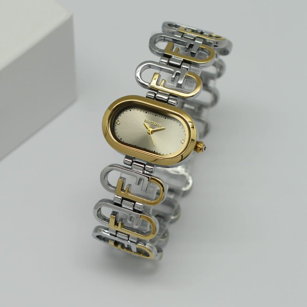 ساعة نسائية بلون ذهبي وفضي تُعتبر قطعة أنيقة وعصرية تتميز بالعديد من المزايا والتصميمات المميزة. إليك وصفًا عامًا لهذا النوع من الساعات الراقية
