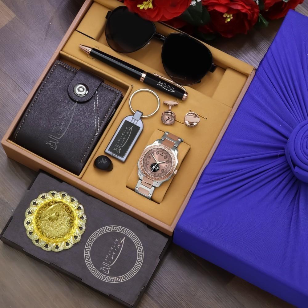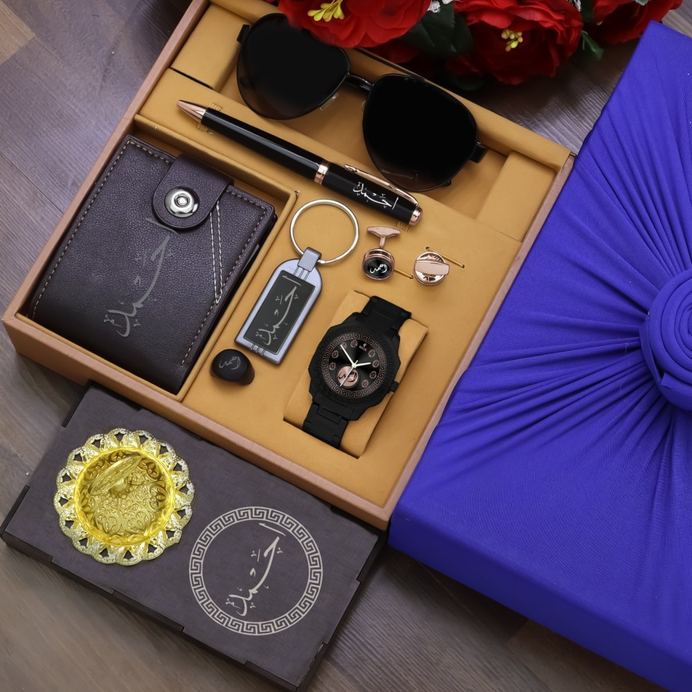 - يتكون الطقم من : (ساعة سل ستيل راقية - كبك - قلم أنيق - محفظة جلد - مبخرة خشبيه - نظارة - ميدالية مفاتيح - خاتم سل ستيل - علبة طقم فخمة - كيس هدايا كرتوني).